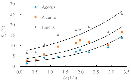 Equation (2) was used to calculate the plant drag coefficient. The results suggested that the drag coefficient of different plants was 0.61–26.24, it decreased as the flow rate rose, and that , shown by the comparison between different plants (Figure 4). Equation (3) was employed to calculate the resistance of different plants to water flow. Calculations showed that the drag force of different plants to water flow, i.e., resistance FD, was 1.49–25.17 N, which increased with water flow, and that the comparison between different plants suggested that (Figure 5).