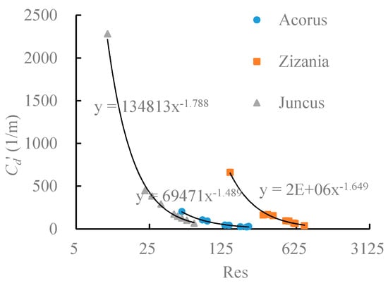As indicated by existing research findings [,], the plant drag coefficient Cd’ and plant stem’s Reynolds number Res showed the following relation with non-submerged flow: