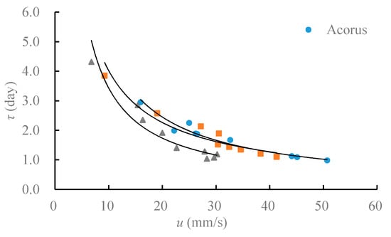 Standard length of the drainage ditch was 1000 m, according to previous assumption, based on which Equations (7), (8), and (10) were used to calculate the residence time and hydraulic surface loading of drainage ditches at different discharge flow rates, with their relationship with the average water velocity analyzed. Results suggested that the residence time of different drainage ditches lay between 0.98 and 4.32 days (Figure 7). As the flow rate rose, the residence time of drainage ditches with different plants declined. A comparison between different plants showed that and (Figure 8).