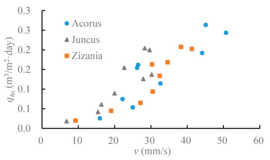 For a surface flow-constructed wetland, a longer residence time and smaller hydraulic surface loading would help with contamination removal. According to the design requirements for surface flow-constructed wetlands, residence time τa > 2 days, and hydraulic surface loading qhs < 0.1 m3/(m2·day). As indicated by Figure 7, the three kinds of plants met the requirements when the average surface flow velocity was less than 16.3 mm/s, during which the ditch showed excellent wetland characteristics.