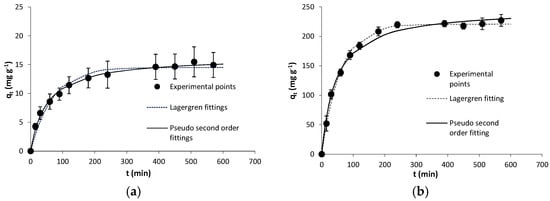 The fittings of the experimental results to the kinetic models of Lagergren (pseudo first-order) and pseudo second-order are shown together with the experimental results in