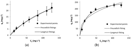 Although the isotherms show a similar trend, the difference between the adsorption capacities of both adsorbent materials is remarkable. The fittings of experimental results to the Langmuir and Freundlich adsorption isotherms are shown in