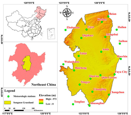 Location of the Songnen Grassland in China and the meteorological stations considered.
