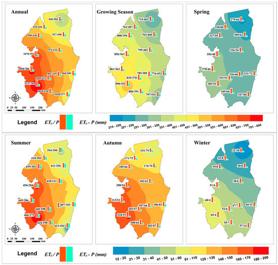 For ET0, the average of the annual and growing season values increased from the northeast to southwest, with values less than 850 and 750 mm, respectively, to more than 1100 and 980 mm, respectively. Seasonally, all of the stations showed higher ET0 in the summer, followed by spring, autumn, and winter. For P, the annual value and that of the growing season increased from west to east, ranging from 381 to 577 mm and from 352 to 511 mm, respectively. The minimum was found in Tongyu, and the maximum was found in Changchun. Seasonally, higher amounts of precipitation were exhibited during the summer, followed by autumn, spring, and winter. The maximum difference was distributed in the southwest at all time scales (Figure 2), especially for the annual values, reaching 700–800 mm in the southwest. From a seasonal perspective, the maximum value of the difference occurred in the spring, ranging from 215 to 350 mm and was followed by summer, autumn, and winter.
