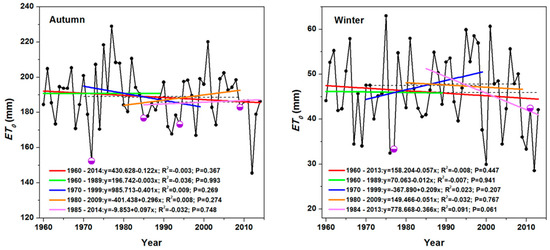 Linear trend and break trend analysis (for every 30 years) of ET0 from 1960 to 2014. The black dashed line is the average value of the four climatological normal periods.