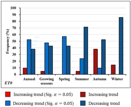 Frequency of ET0 trends for the 21 stations based on the Mann-Kendall (MK) test in the Songnen Grassland during 1960–2014 (%).