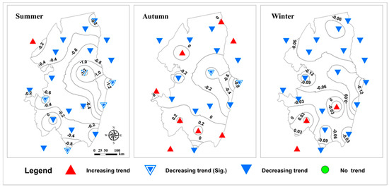 The spatial variations of ET0 trends at different time scales from 1960 to 2014 based on the MK test are displayed in Figure 5. All considered time scales indicated a similar pattern, with the majority of the time series of ET0 indicating a downward trend in the entire region, except during autumn. The greatest number of stations with significant decreasing trends of ET0 were distributed in the eastern, northeastern, and central regions and frequently occurred in the annual, spring, and growing season periods. These regions also had the highest rate decrease in ET0, ranging from −0.2 to −4.0 mm/a. However, positive changes were recorded in the southwestern and southern regions in autumn and winter, but they were statistically insignificant, with rate increases ranging from 0.01 to 0.40 mm/a. Overall, the spatial pattern of ET0 change in the Songnen Grassland is that of a significant downward trend across the central region with a gradually reduced intensity from the eastern parts to the western areas.