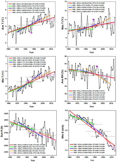 Comparing the results of the detected change points of ET0 with the climatic factors in the annual time scale during 1960–2014, abrupt changes were detected in 1989, 1994, and 2009, while the most sensitive factors, Ave RH and Max T, were detected in 1993 and 1989. There is a good correspondence between these two sensitive factors and the ET0 series. However, undoubtedly, the abrupt change of other climate factors also played an important role in the abrupt changes of ET0. From 1989 to 1994, the ET0 experienced an abrupt decreasing trend due to the abrupt increasing trend of Max T, Min T, and Ave T, and decreasing trend of Sun H and Win S; the Ave RH also experienced an increasing trend until it reached the year of abrupt change in 1993. From 1994 to 2009, the ET0 experienced an abrupt increasing trend arising from the abrupt increasing trend of Max T, Min T, and Ave T, and the decreasing trend of Ave RH, Sun H, and Win S. After 2009, the temporal trend of ET0 decreased again, although no change points of the climate factors were detected. This can be due to, as shown in Figure 3, the decreasing trends of every climate parameter except for the Ave RH.