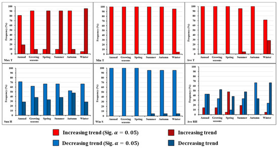 The MK test was used for detecting the statistical significance of the climatic parameters trends at the 21 stations in the annual, seasonal, and the growing season time series during 1960–2014. The results are summarized in Figure 7. For Ave T and Min T, the percentage value of the statistically significant increase (α = 0.05) was 100% at all considered time scales, except during winter (95% in Min T and more than 70% in Ave T). In the case of Sun H, all of the annual, seasonal, and growing season series illustrated downward trends, ranging from 52% to 71% and being statistically significant decreases. As for Win S, significantly decreasing trends were found roughly 100% of the time at all locations. For Ave RH, an overwhelming majority of data series saw negative trends, but in spring, positive trends were detected at more than 50% of the stations.