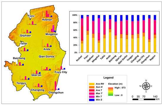 where ET0 is the reference evapotranspiration, and is the precipitation. If the AI is equal to or close to 1, it indicates that there is no precipitation, and aridity is the highest. In contrast, if the precipitation is equal to or higher than ET0, the AI will be equal to 0 or negative. The AI values of the growing season at each station were calculated, and the average AI in the entire Songnen Grassland was expressed by the arithmetic average from the stations in and around the region.