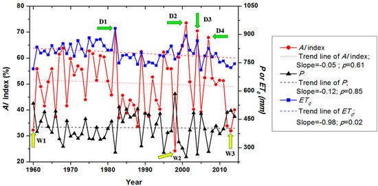 Comparison of the temporal trend of ET0, AI, and P during 1960–2014. D, the drought year; W, the wet year. The slopes are examined by linear regression.