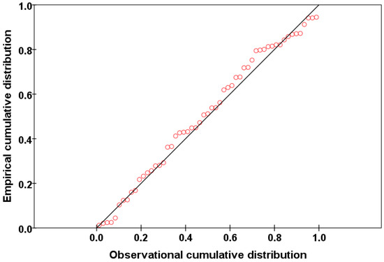 Equation (6) indicates a positive correlation between AI and ET0 and a negative correlation between AI and P. The regression residual standard error is displayed in Figure 10 to test the validity and accuracy of Equation (6). It indicated that the residuals are approximately normally distributed since all 55 residuals are distributed around the diagonal line, and it also illustrated that the regression equation (Equation (6)) is in line with the normal distribution. Thus, Equation (6) is statistically significant. Furthermore, the upward trends of ET0 and AI were associated with the downward trends of P and vice versa. This characteristic was highly explicit during the drought and wet years in particular. As shown in Figure 10, during the severe drought years D1 (1982), D2 (2001), D3 (2004), and D4 (2007), the values of ET0 and AI had reached or were close to the maximum in the last few decades; however, the values of P had almost reached a minimum at the same time. Similarly, the wet years, such as W1 (1960), W2 (1998), and W3 (2013) had lower values of ET0 and AI (Figure 9).