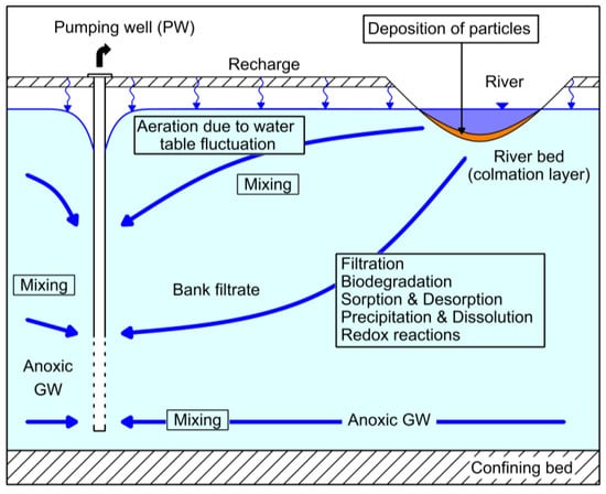 From a water resources perspective, RBF is normally characterized by improved water quality [1,2]. Therefore, RBF is a well-proven treatment step which, at numerous sites, is part of a multi-barrier approach to the drinking water supply. The positive effects of RBF arise primarily in the mixing, sorption, and degradation processes. The whole process can be thought of as occurring in two distinct steps: