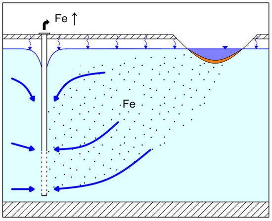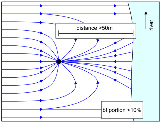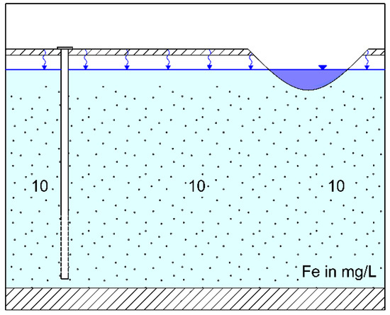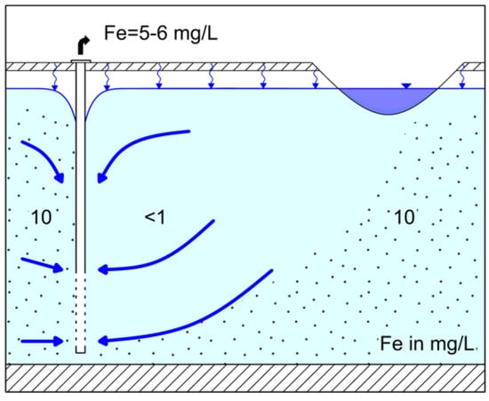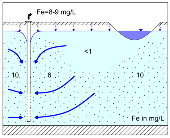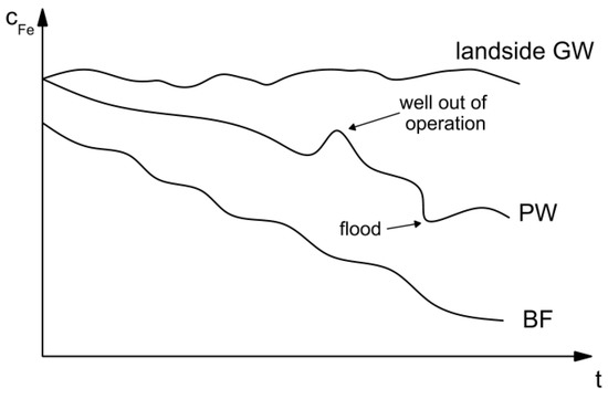 In some cases, the pumping rate of a test well has been too low compared to the distance to the riverbank, or it was not continuously pumped [13]. In such cases (Figure 14), the portion of bank filtrate would be very low and no “wash out” effect for iron would be observed.