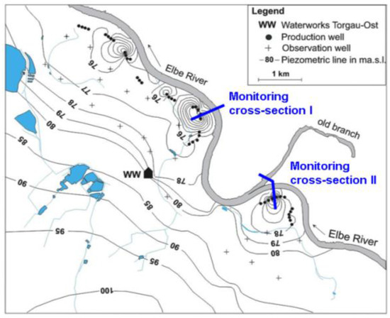 - Nestler, W.; Walther, W.; Jacobs, F.; Trettin, R.; Freyer, K. Water Production in Alluvial Aquifers along the River Elbe; UFZ-Research Report 7; Helmholtz Centre for Environmental Research: Leipzig, Germany, 1998; p. 203. (In German) [Google Scholar]