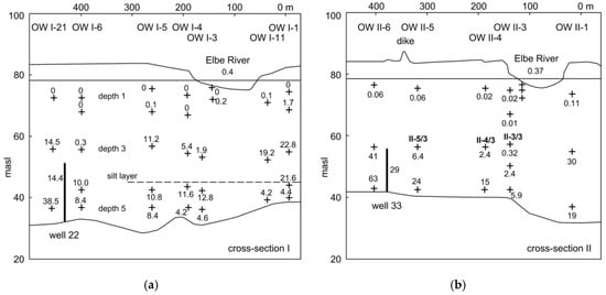 The iron concentration in the abstracted water of the wells in the whole catchment covers a wide range, with an average value of 17 mg/L for the observed wells. Additionally, large variations of iron concentration (from 0 to over 100 mg/L) can be observed over the vertical expanse of the aquifer [10]. In the bank filtrate the median Fe(II) concentrations increased very slightly by 0.25 mg/L, up to the OW nearest to the Elbe River. In the shallow depths, no increase in Fe(II) concentration was found, as expected in the presence of nitrate. In cross-section I a decrease in iron concentrations was found below the silt layer, likely due to the infiltration of groundwater from the right-hand side of the Elbe River. The old groundwater at the greatest depth showed iron concentrations of about 4 mg/L.