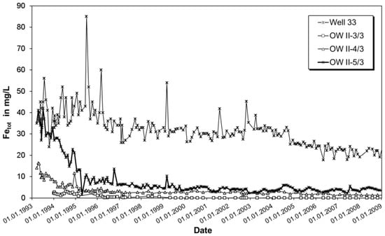 Before well 33 was put into operation in 1993, the water sampled from OW II-5/3 was under the strong influence of landside groundwater, which showed iron concentrations as high as 100 mg/L. Depending on the water level in the river, iron-rich landside groundwater can enter the region between the wells and the river, during times when well 33 is operating at a low flow rate or the well gallery is not in operation. This water is subsequently extracted from the wells, leading to iron concentration peaks in the raw water. The augmented flow of bank filtrate, brought about by the steady operation of wells, led to a drastic reduction in median iron concentrations during the period from 1993 to 1998 from 34 mg/L to 4.4 mg/L at OW II-5/3 (bank filtrate) and from 1993 to 2009 from 40 mg/L to 20 mg/L at well 33 (mixture of bank filtrate and groundwater), as well as manganese concentrations from 1.6 mg/L to 0.1 mg/L at OW II-5/3 and from 1.6 mg/L to 0.9 mg/L at well 33 during the same periods. The decreasing iron and manganese concentrations could be explained as a result of leaching of the most reactive Fe(OH)3 phase in the aquifer between the river and the well.