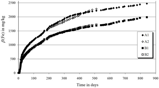 In January 1994, four columns were setup to run in a closed loop with extraction chemicals, each containing 1000 g of air-dried soil, sieved to below 2 mm. The iron content of the soil samples was in the range of 0.2%–0.4%, typical for Quaternary medium sand. In the first three extraction steps a total of only 5 mg/kg of iron was released. The fourth extraction step with hydroxylammonium chloride solution allowed a repeated extraction of iron at concentrations between 20 and 26 mg/L iron, virtually without end. Therefore, the solutions were renewed weekly in the beginning, later every two weeks, to continue the iron extraction and to quantify the easily-reducible iron fraction. Two experiments with two columns in parallel ran over 511 days, and two other columns over a total of 873 days.