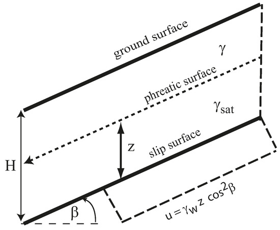 There are two classic models of translational slope stability. Both models apply to “infinite” slopes, which practically means that the thickness () of the sliding soil mass is much smaller than the length () of the slope, say, 30, and is commonly less than 2 m [7], although it may be deeper. The first model of the translational stability of long slopes is widely used [5]. It prescribes a phreatic surface parallel to the ground surface and the slip surface, as shown in Figure 1.