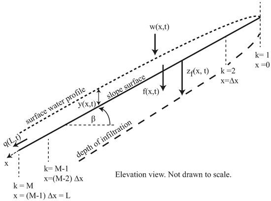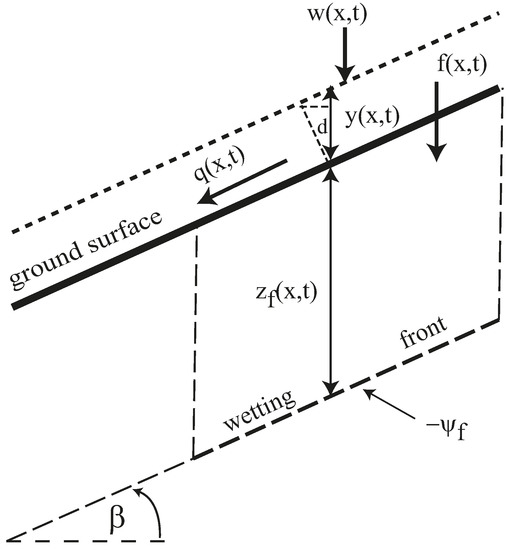 All of the nomenclature shown in Figure 3 was described above, except for the wetting-front soil-water tension , a soil property, estimable from the textural parameters [16,17,18]. The pressure head on the wetting front equals . The infiltration at position and time , , is given by the following expression under the assumption of a uniform distribution of the volumetric water content () on the slope’s soil: