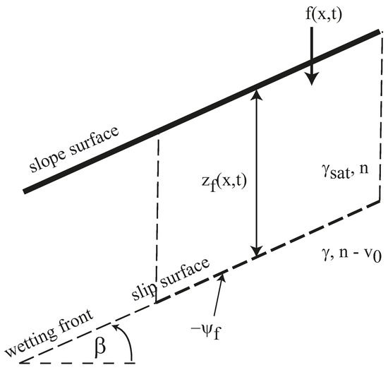 This paper fundamentally departs from the classic long-slope, translational, failure mechanism embodied by Equation (1) and diagramed in Figure 1. Figure 5 depicts an advancing wetting front on the sloping terrain. The antecedent soil-moisture deficit equals , with and denoting the porosity and initial volumetric content of the slope soil, respectively. Prior to slope saturation, the soil’s (wet) unit weight equals . The soil within the saturated thickness extending from the surface to the wetting-front depth has a saturated unit weight .