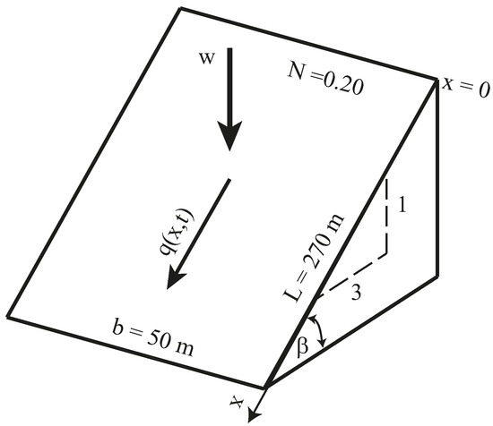 Runoff on a slope surface is wide and shallow, so that the hydraulic radius is approximately equal to . Runoff is herein modeled with the kinematic-wave approximation to the equation of 1-D (shallow and wide) overland flow, with accretion by rainfall and depletion by infiltration (see, e.g., [13,14,15]):