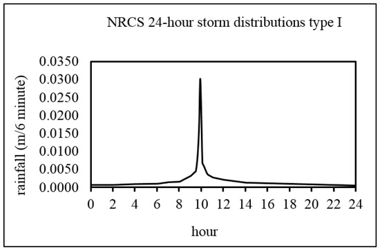 The rainfall input applied in this example follows a United States Department of Agriculture’s (USDA) National Resources Conservation Service (NRCS) type I distribution over a 24-h duration. The total depth of rainfall over its 24-h duration equals 0.40 m in this example. Figure 7 depicts the hyetograph of the rainfall event applied in this example. The maximum rainfall occurs at time 9.9 h with a depth of rainfall equal to 0.030 m falling over a 6-min interval, which is the time interval employed to construct the graph of Figure 7.