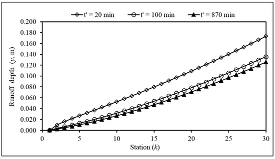 As seen in Figure 9, the runoff depth rises with an increasing distance downstream from the slope crown (where = 0 and 0 m). The time elapsed since the beginning of runoff is denoted by , in which = 34,200 s = 570 min = 9.50 h. The runoff depth at = 20 min occurs during the steep rising limb of the hyetograph shown in Figure 8. The runoff depth continues to increase until = 24 min, when the rainfall reaches its maximum intensity (see Figure 7). Thereafter, the runoff decreases, as depicted by the graphs of the runoff depth associated with = 100 min and 870 min. The latter time coincides with the end of rainfall, which lasts 24 h. Thereafter, the runoff depth decreases rapidly to zero everywhere on the slope. The post-rainfall runoff depth is not shown in Figure 9.