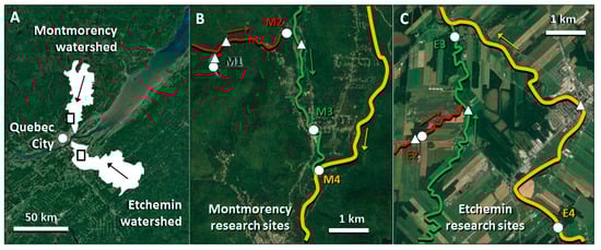 (A) Geographic location of the Montmorency (M) and Etchemin (E) watersheds located on both sides of the St. Lawrence River in Quebec City; (B) Research channels in the M watershed with instrumented sites identified by white circles; (C) Research channels in the E watershed with instrumented sites identified by white circles. Channel colors are representative of their approximate Strahler order. White triangles represent discharge estimation sites, and white circles indicate environmental parameter monitoring sites.