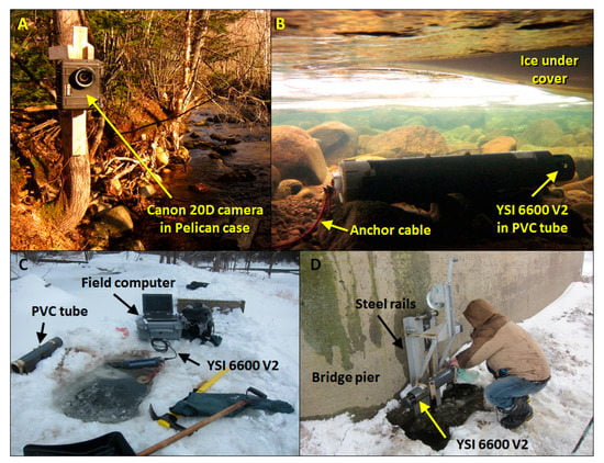 Specific water quality monitoring sites (white circle in Figure 1) along each channel were first identified based on the position of nearby tributaries. Indeed, in order to attain the research objectives, instruments were anchored far downstream or some distance upstream of tributaries in order to minimize local water quality interferences that would not be representative of the reach characteristics. The instrument position was also selected based on accessibility and shelter from adverse phenomena. At each site (seven in total), a YSI 6600 V2 probe was placed in PVC tubes anchored to the riverbed (Figure 2B) where inspections, calibration and battery changes would remain possible throughout winter (sometimes after tremendous amounts of the authors’ calories spent breaking the ice cover; Figure 2C). At one site (E3), the channel depth and ice thickness imposed a more robust anchoring installation on a bridge pier (Figure 2D). Environmental parameters were also manually measured using a portable YSI Pro 2030 (Tw, Sp.C, DO) and a Lamotte 1979-EPA (Turb) several times during winter in order to confirm that YSI 6600 V2 sensors were not malfunctioning. In minor cases, data points were removed because of suspicious data of known (e.g., anchor ice) or unknown (e.g., possible fish or larvae using the sensor as a habitat or winter shelter; Figure 3) origin.