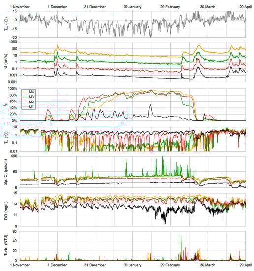 Hourly data (air temperature (Tair), discharge (Q), ice coverage (Ic), water temperature (Tw), specific conductivity (Sp.C), dissolved oxygen (DO) and turbidity (Turb)) from 1 November 2011 to 29 April 2012 at Sites M1, M2, M3 and M4.