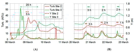 Hourly turbidity (Turb) and water depth (Y) data from Sites M2 and M3 (A) from 8 March to 11 March and (B) from 20 March to 23 March. The delay between turbidity and local Q peaks vary between 1 and 25 h.
