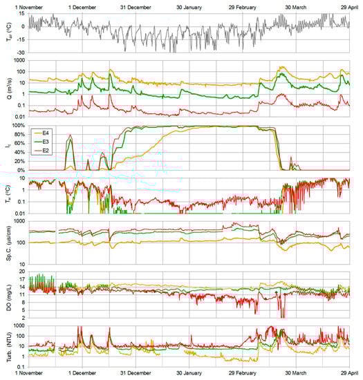 Hourly data (air temperature (Tair), discharge (Q), ice coverage (Ic), water temperature (Tw), specific conductivity (Sp.C), dissolved oxygen (DO) and turbidity (Turb)) from 1 November 2011 to 29 April 2012 at Sites E2, E3 and E4. The red diamonds in the DO graph represent punctual measurements at Site E2 with a portable instrument.