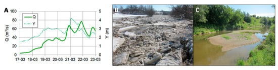 (A) Measured water depth (Y) and estimated discharge (Q) at breakup on the third order channel E3 showing the signature of an ice jam; (B) ice jam (photograph taken on 21 March 2012) and (C) new gravel bar formed where the jam toe had been momentarily located (photograph taken on 1 August 2012).