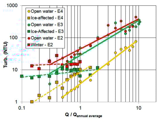 Data and power function interpolations between open water and ice-affected turbidity-Q relationships at Sites E4, E3 and E2. Q is made dimensionless by using the annual average Q at all sites.