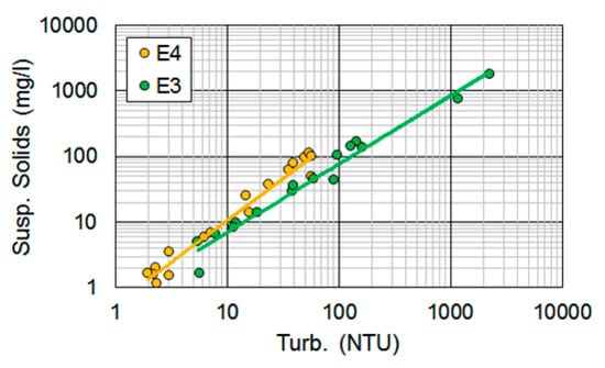 In the E watershed where a significant ratio of sediment transport takes place in the form of suspended load, Figure 6 and the data interpretation revealed that sediment transport rates were higher in smaller channels and that dilution tended through the drainage system. This could either be due to a decreasing proportion of agricultural land use (i.e., sediment supply; Table 1) or to a reduced sediment transport capacity (Site E4 being located in a small reservoir and Stream E3 presenting the lowest gradient). A change in land use from forest to agricultural (or logging) can substantially modify sediment transport modes and intensities in river systems by increasing fine sediment supply. Knowing that fine sediment can transport contaminants and obstruct gravel bed habitats [], further investigation should reveal how this can impact the fluvial environment.