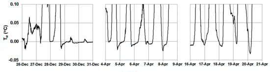 Finally, the surprisingly high Tw at Site M4 was probably caused by a local groundwater source that had not been identified before winter (the YSI 6600 V2 was sheltered in small pool along the bank []). At that site, measured Tw = 0.00 °C started with the massive formation of anchor ice and ice dams (6 January) and ended when the breaching of ice dams was over (9 February), leaving the ice cover suspended above the flowing water.
