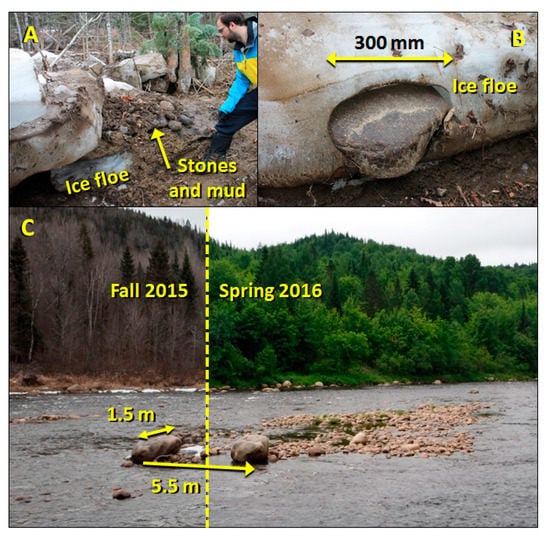 (A) Stones and mud found on an ice floe deposited in the floodplain after the 2014 breakup in the Montmorency River; (B) 300-mm stone trapped in thermal ice deposited on the floodplain after the 2014 breakup in the Montmorency River; and (C) 1.5-m boulder pushed by an ice run (1 April 2016) in the Ste. Anne River (left and right photographs respectively taken before and after winter at a similar discharge).