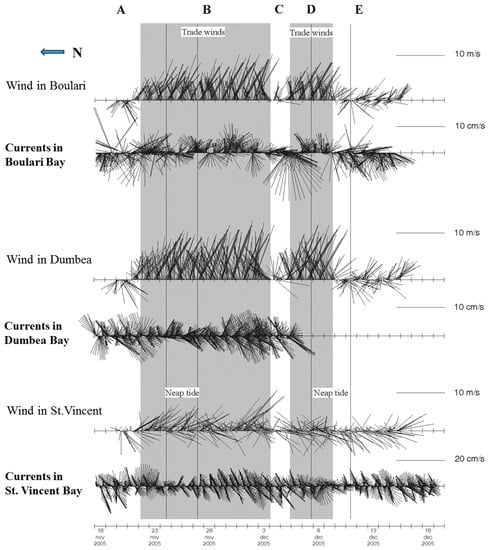 In Boulari Bay, the neap/spring tide cycles had a non-significant influence on the currents measured 3 m above the seabed (Figure 2). In the absence of trade winds (periods C and E), a strong westward flow was observed during several days and may indicate the development of a cyclonic gyre circulation along the isobaths from Mont-Dore (SW of Boulari Bay) towards Nouméa (as described by Fernandez et al. [27]). This gyre results from the conjunction of the propagation of the tide along the coastline of the bay. During trade winds (periods B and D), which blew from an E-NE direction in the Coulée River valley in the morning and from the SE in the afternoon, an anticyclonic gyre generated flows toward the East (as described by Douillet et al. [39]). However, during short periods (28 and 30 November and 2 December), flows in the opposite direction were observed. The present data suggest the strong impact of winds on currents in Boulari Bay, and the formation of a drive out phenomena of waters which were accumulated at the bottom of the bay only when trade winds blow.