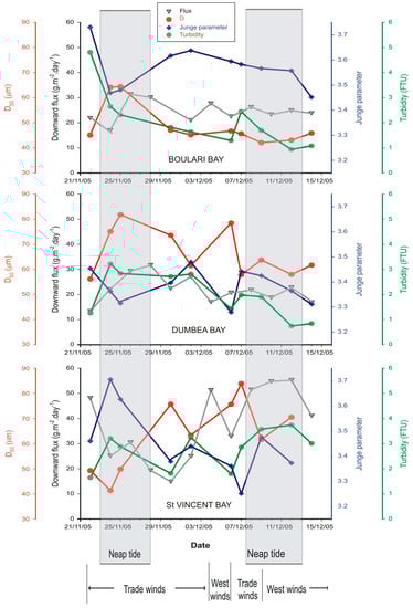For each bay, variations in the fluxes, turbidity, D50 (mean diameter of SPM from measurements in the range 1.25–250 μm) and Junge parameter (s) during the study period are presented in Figure 3.