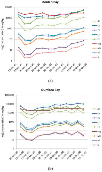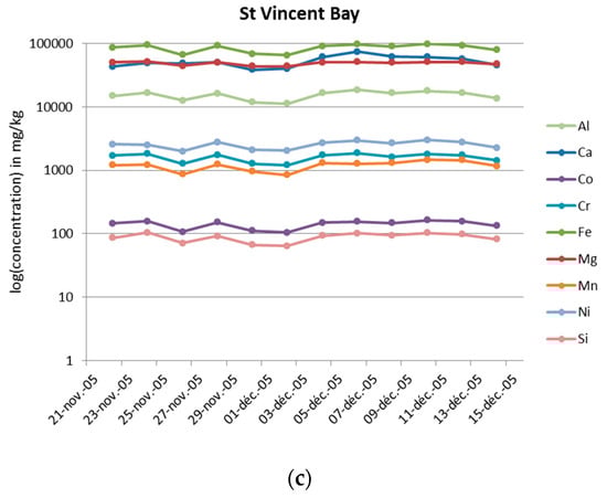 In terms of intra–site variability, the metal and Ca concentrations remained relatively constant in St Vincent Bay’s SPM, while they evolved in Dumbéa Bay and particularly in Boulari Bay (Figure 4). This time-variation started with high metal concentrations at the beginning of the study period (21 and 22 November) followed by a strong decrease over a 4-day period (23 to 27 November) before increasing to the highest values at the end of the sampling period. This increasing trend was irregular in Dumbéa Bay, where the highest concentrations were observed from 4 December, while in Boulari Bay, the increase was slight but continuous to reach the maximum values for all the metals and Ca on 14 December. The mean concentrations increased about 2, 3 and 5 times, in St Vincent, Dumbéa and Boulari bays, respectively.