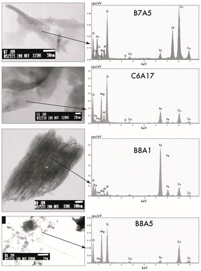 A chemical analysis of a goethite particle referenced as B8A1 (Table 11 and Figure 6) yields similar results to the one given by [50]. Chrysotile (a mineral from the serpentine family) particles forming long acicular tubes were also detected (referenced as C6A17 in Table 11 and Figure 6. This mineral is formed in fractures of the ultrabasites and results from an episode of serpentinisation which concentrates Ni [50]. Compared to other serpentinites analysed previously [50,60], the analysed chrysotile particle had a comparable chemical composition (Table 11). A particle with a different composition (less Al and Mg and more Fe) was also detected (referenced as B8A5 in Table 6 and Figure 6. The composition of this particle is comparable to a poorly crystallized smectite named crypto nontronite [50], which is found in sediments of the deltaic plain and probably originates from diagenesis.
