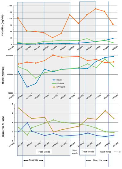 Particulate Ni flux, distribution constant (Kd) of Ni and dissolved concentration of Ni for Boulari, Dumbéa and St Vincent bays over the study period (21 November to 14 December 2005), 3 m above the seabed.