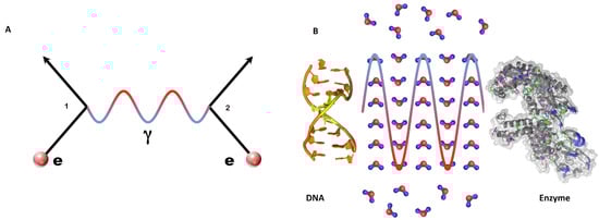 The model is based on the QFT interaction paradigm, which describes the interaction between two systems by the mutual exchange of a mediating wave field or quantum, in analogy with the photon exchanged by two electric charges in quantum electrodynamics [15,16] (Figure 1). The basic constraint in the model construction comes of course from the physical characterization of the system under study. In our case, we have the macromolecules of DNA and enzyme and the water molecules, whose number under standard biological conditions constitutes the supermajority of the system molecules. DNA, enzyme, and water molecules are endowed, as their distinctive physical property in this model, with configurations of electric dipoles. Our modeling is thus focused in a natural way on the radiative dipole interaction.