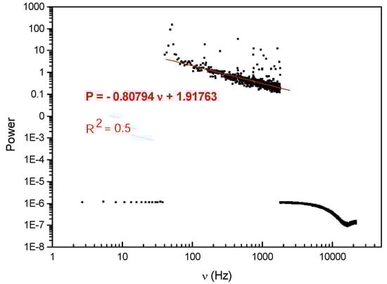 Our standpoint is consistent with previous experimental work [3,4,5,6] that has shown that some DNAs in water dilutions emit electromagnetic waves of low frequency (from hundreds to ≈3 kHz) which could be triggered, as in a resonance phenomenon, by an outside excitation, such as the Schumann waves [19]. Experimental peaks of Schumann waves are at 7.83, 14.3, 20.8, 27.3, and 33.8 Hz; the peak near 7 Hz is the one found to be minimally active in the case discussed here (for further details see [3,4,5,6]). The electromagnetic signals (EMS) can be amplified and recorded as a digital form. In Figure 2 the log-log plot of the EMS from the water solution of a DNA HIV-1 fragment (LTR, 194 bp) (cf. Appendix A) is reported. The decimal dilutions of original concentration of 2 ng/mL HIV-1 emitting EMS are between and (the first of the serial dilutions do not emit detectable signals) [3,4,5,6]. In the range between about 100 and 2000 Hz the signal shows fluctuations densely distributed around the linear fit with negative slope coefficient d = 0.80794, thus exhibiting scale-free, self-similar behavior in that frequency range with self-similarity (fractal) dimension d. It is known [20,21,22,23] that such a fractal-like self-similarity structure is the manifestation of coherent dynamics active at a microscopic level, as we indeed find in the following sections.