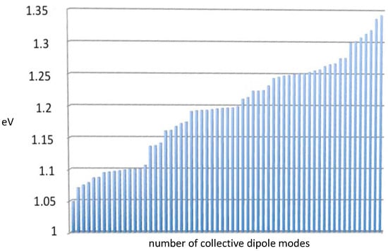 In regards to the spacing between aromatic amino acids in protein, when considering tryptophan, tyrosine, and phenylalanine, the spacings are as close as 5 Å in the enzymes of interest, comparable to the inter-dipole spacing of DNA (3.4 Å). We consider the pairwise interaction potential between each amino acid electric dipole in the enzyme’s aromatic network. has a similar expression to the one for DNA considered above (cf. Equation (1)), but without helical symmetry and including pairwise, not just nearest-neighbor, aromatic dipole couplings. The enzyme collective modes, like the DNA modes, are dipole fluctuation modes and can be used to construct the creation and annihilation operators for the radiative electromagnetic field quanta acting on the water molecules. Collective modes for Taq are presented in Figure 3. The average energy for these Taq modes is 1.2 eV.