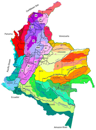 - CTA; GSI-LAC; COSUDE; IDEAM. Evaluación Multisectorial de la Huella Hídrica en Colombia. Resultados por Subzonas Hidrográficas en el Marco del Estudio Nacional del Agua 2014. Medellín, Colombia. 2015. Available online: http://documentacion.ideam.gov.co/openbiblio/bvirtual/023272/HH_ENA2014.pdf (accessed on 15 April 2017).
