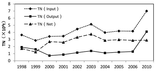 Taihu Lake is the third largest freshwater lake in China, with an area of 2338 km2 and an average depth of 2 m. The average growth rate of Gross Domestic Product (GDP) was 13.46% and the average growth rate of the population was 5.24‰ from 1991 to 2008 in Taihu Lake basin. This growth has resulted in large quantities of nutrients being discharged into Taihu Lake, which have caused eutrophication of the lake [1]. After years of environmental regulation, eutrophication problems are still serious. It has been reported that the main source of pollution into Taihu Lake was from the rivers around the lake, and nitrogen (N) was the main pollutant of these rivers [2,3,4]. Paired-sample T test analysis indicated that the input of total nitrogen (TN) to Taihu Lake was different (p = 0.034 < 0.05) between the 1990s and the early 21st century, and the inputs of TN to Taihu Lake were still rising (Figure 1) [5,6]. Some research illustrated that the inflowing rivers in the west or northwest of Taihu Lake were seriously polluted, and more than 70% of the TN entering Taihu Lake was from the northern rivers [7]. Therefore, it is important and necessary to study the sources of N in the northern rivers. With the rapid development of the economy and the population increases in recent decades, excess nitrogenous substances have drained into the rivers [8] from synthetic N fertilizers [9], animal wastes and manure, sewage, and atmospheric deposition [10], which has caused adverse effects on the water’s ecological environment, such as eutrophication and the degradation of ecosystems (National Research Council, 2000). According to the date of pollutants of Taihu Lake in 1998, the pollutants from domestic sewage and agriculture accounted for 25% and 28% of TN, respectively [11]. It is necessary to identify the sources and transformations of nitrate in water to control nitrate pollution.