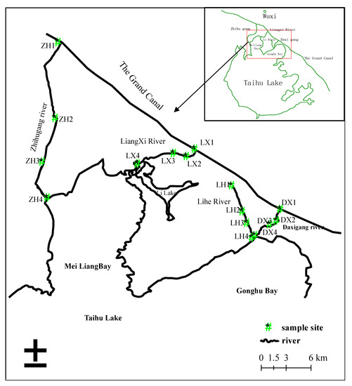 Water samples were collected from the Zhihugang (ZH), Liangxi (LX), Lihe (LH), and Daxigang (DX) rivers from 5 to 15 December 2013. Sampling sites ZH1, LX1, LH1, and DX1 were located in the upper reaches of the rivers and were surrounded by many industries and houses. Sampling sites ZH4, LX4, LH4, and DX4 were located in the estuaries to Taihu Lake. Sampling sites ZH2, LX2, LX3, LH2, LH3, DX2, and DX3 were adjacent to settlements and cropland. Sampling sites ZH3 and LH3 were located in industrial areas (Figure 2).