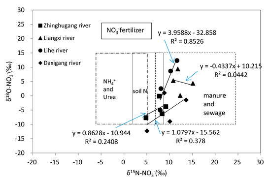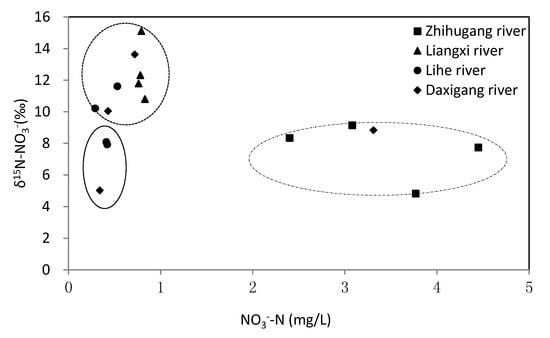 Relationships between NO3−-N and δ15N-NO3− in the Zhihugang, Liangxi, Lihe, and Daxigang rivers.